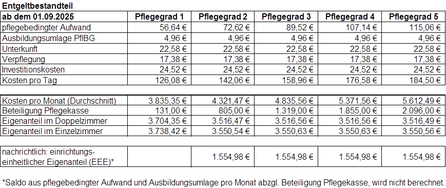 Alle oben genannten Pflegesätze werden regelmäßig neu mit dem Landschaftsverband Westfalen-Lippe und der Arbeitsgemeinschaft der Pflegekassen in NRW vereinbart. Daher können wir für die Aktualität der jeweils genannten Beträge keine Gewähr geben. Druckfehler und Irrtümer sind vorbehalten.